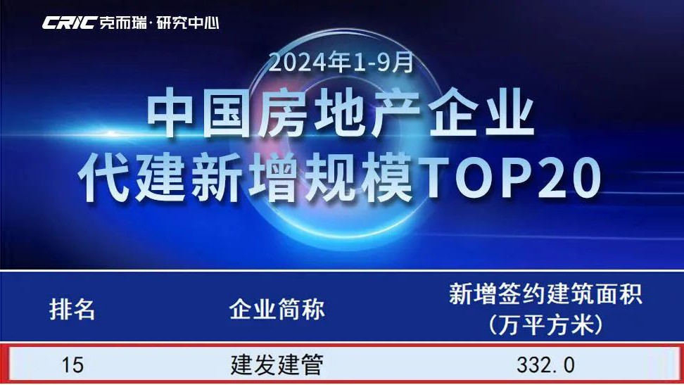 日前,克而瑞研究中心发布了“2024年前三季度中国房地产企业代建排行榜”,建发建管再获“中国房地产企业代建品牌传播力”TOP9及“中国房地产企业代建新增规模”TOP15双荣誉,以品质与专业赢得行业认可。