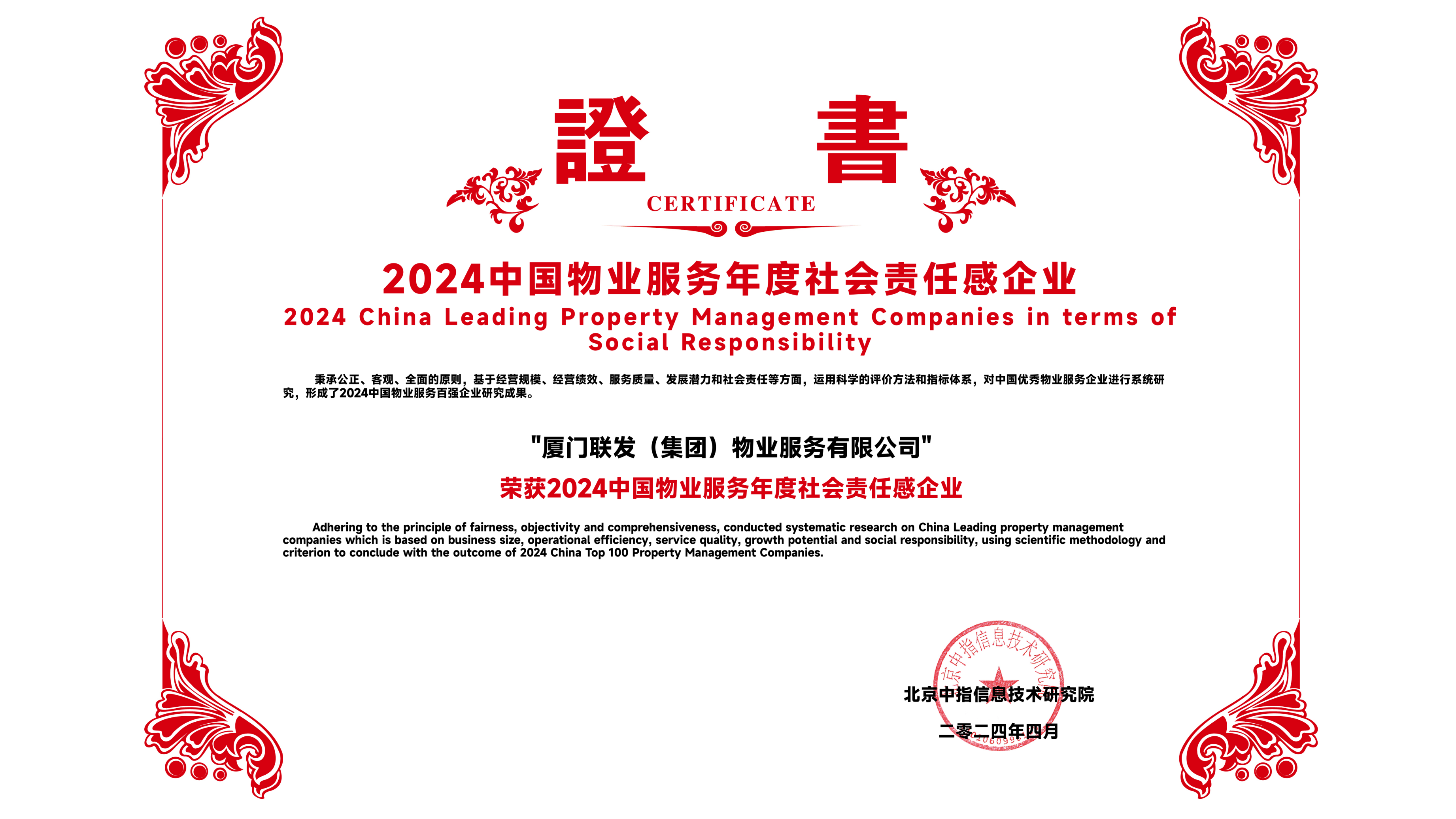日前,北京中指信息技术研究院发布了“2024中国物业服务百强企业研究成果”,联发物业连续15年荣膺“中国物业服务百强企业”,2024年位列25位,并获“2024中国物业服务社会责任感企业”、“2024中国物业服务百强满意度领先企业”等奖项。联发物业始终以客户为中心,夯实基础服务品质,延伸城市服务边界,为构筑美好新生活不断蓄力。