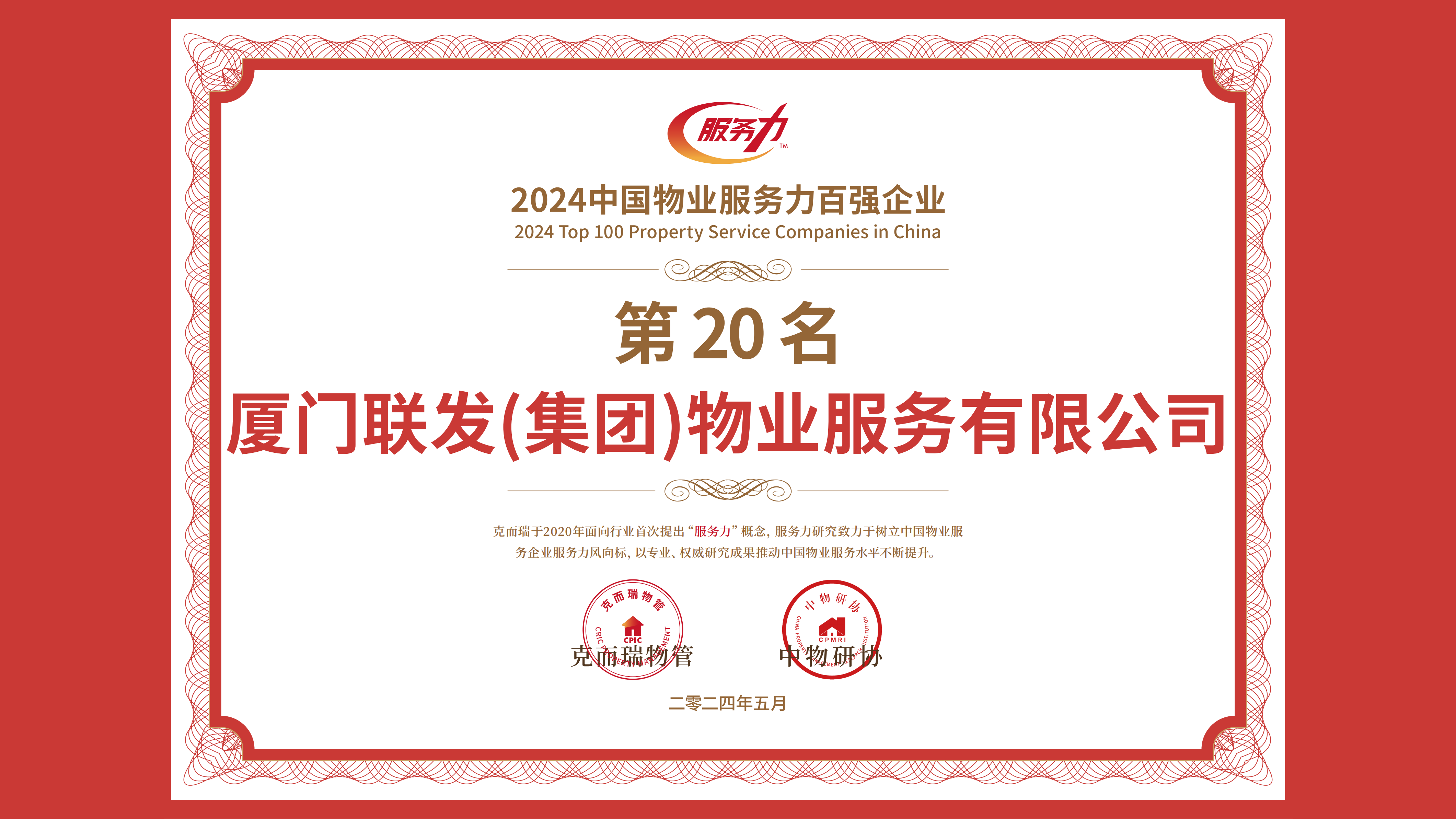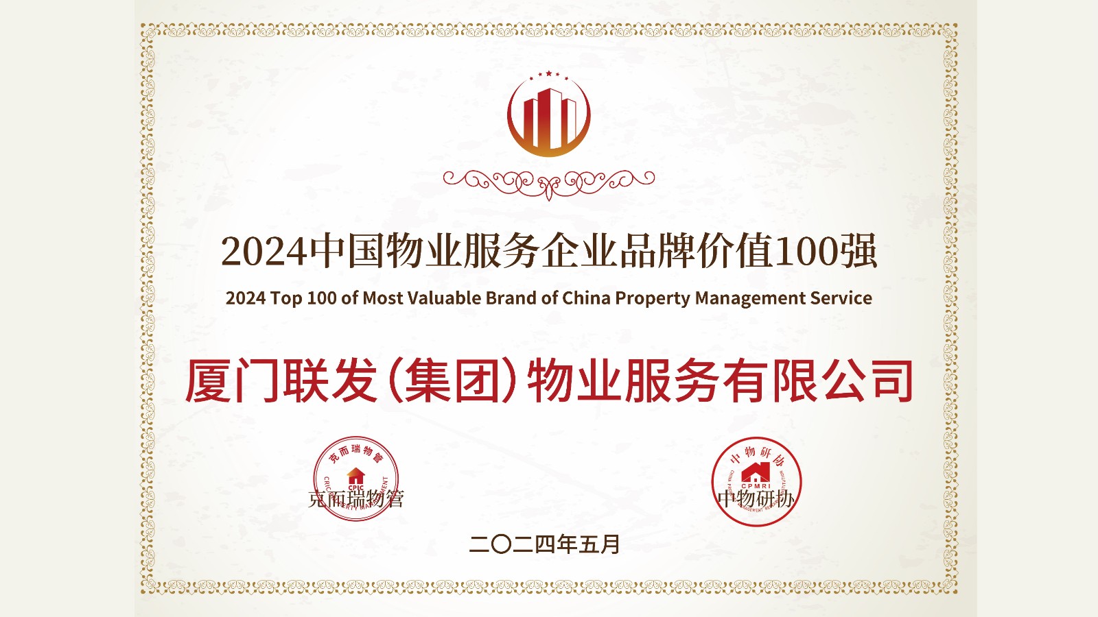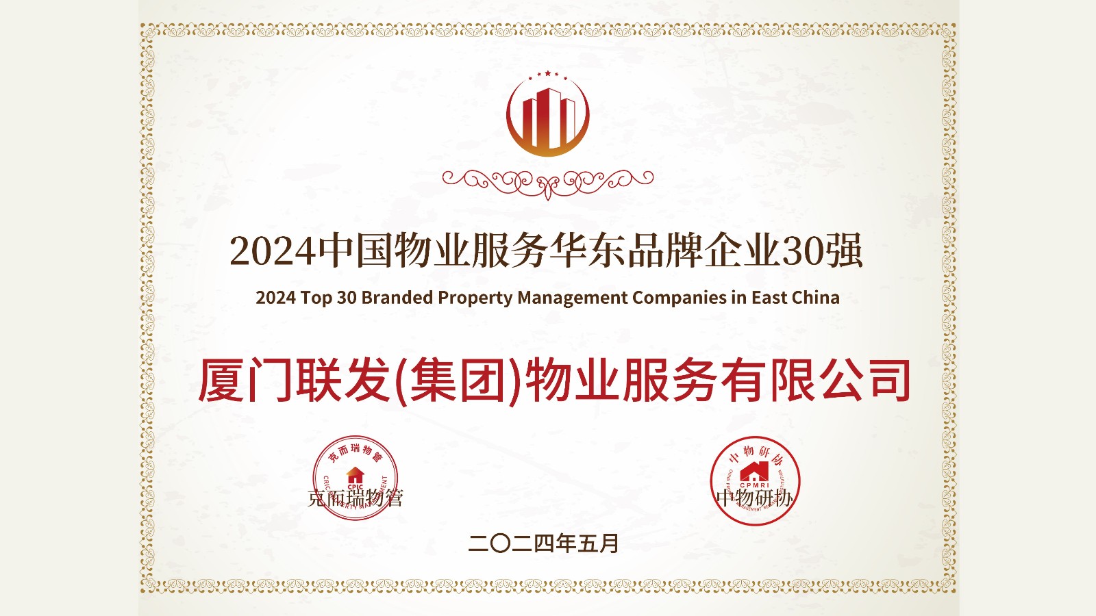 联发集团获“2024中国全周期服务力领先企业"、“2024中国物业服务力百强企业TOP20”、“2024中国物业服务企业品牌价值TOP100”、“2024中国物业服务华东品牌企业TOP30”等荣誉。联发坚持“以客户为中心”,不断拓展服务的深度与广度,以持续迭新的对客全周期关怀赋能美好生活,又一次赢得行业的认可。