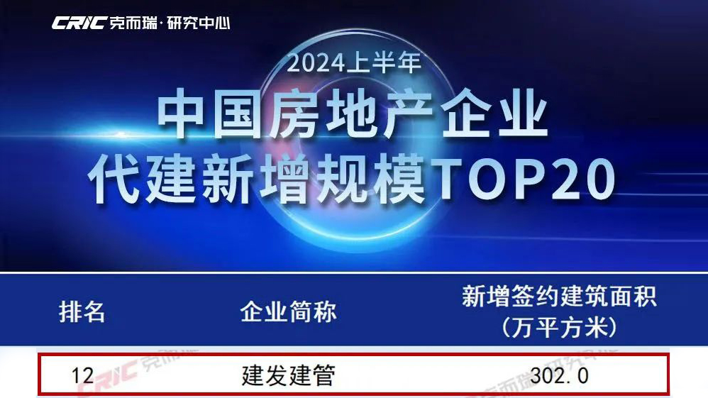 近日,克而瑞研究中心发布“2024上半年中国房地产企业代建排行榜”,建发建管凭借在代建领域的卓越表现及专业实力,位列中国房地产企业代建品牌传播力TOP8及中国房地产企业代建新增规模TOP12。
