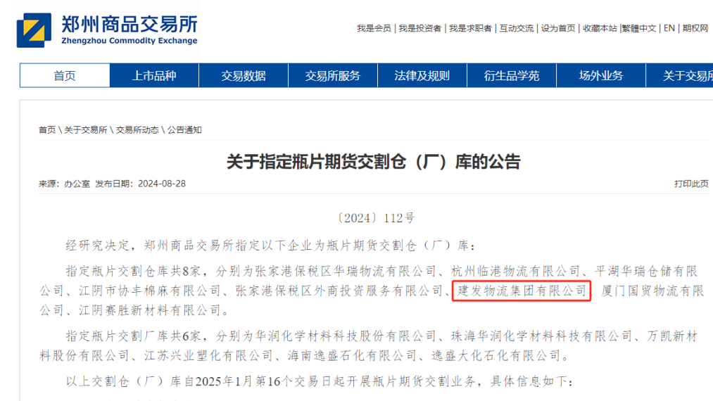 8月28日,郑州商品交易所公布瓶片(瓶级聚酯切片)期货指定交割仓库名单,位于浙江省嘉兴市海盐县的建发物流嘉兴库成为瓶片期货指定交割仓库。