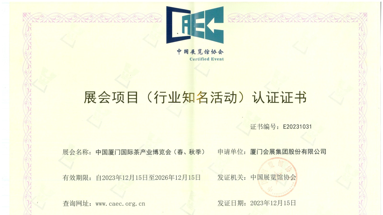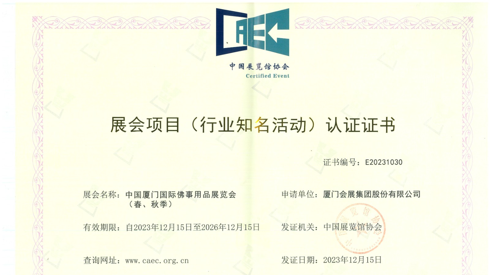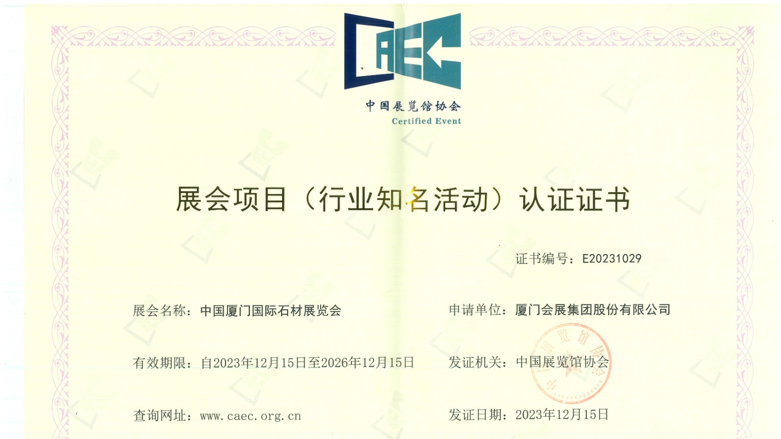Recently, the China Association for Exhibition Centers initiated the third batch of certification for exhibition projects (industry-renowned activities) to further standardize the organization and operation of national exhibitions. Three self-organized professional exhibitions by C&D Exhibition Group - "China Xiamen International Stone Fair," "China Xiamen International Buddhist Items & Crafts Fair (Spring & Autumn)," and "China Xiamen International Tea Industry Fair (Spring & Autumn)" - passed the evaluation and received certification.