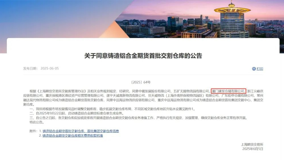 Recently, the Shanghai Futures Exchange announced the list of designated delivery warehouses for cast aluminum alloy futures. C&D Logistics' Ningbo Zhenhai warehouse and Jiaxing Haiyan warehouse have received official approval, marking them as the inaugural delivery warehouses for cast aluminum alloy futures. This represents the first occasion on which C&D Logistics has secured futures delivery warehouse qualifications for a non-ferrous metal product.